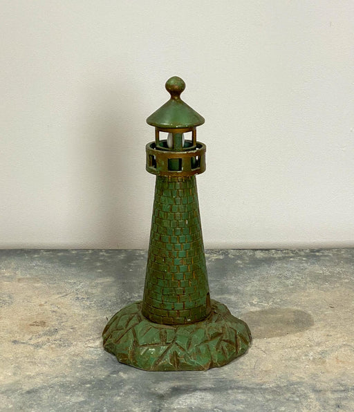 A copper and copper-clad lighthouse lamp. These were made as night lights for children. This one is from the USA, circa 1920.
