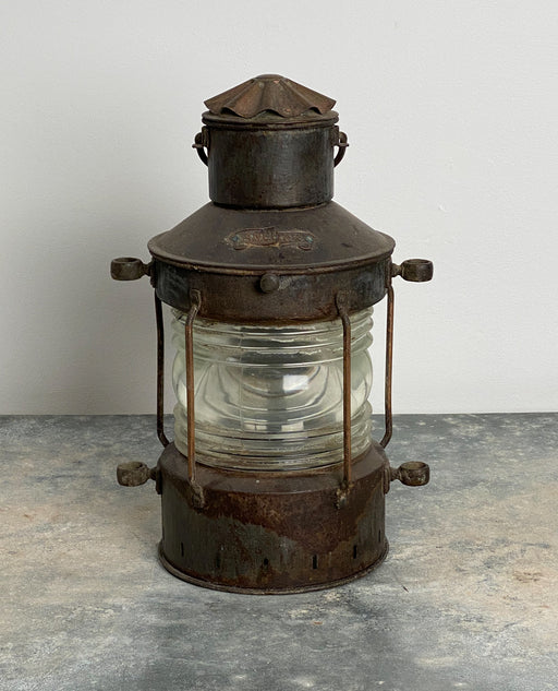 A rare and substantial heavy glass and bronze ship's lantern. Wear and an old crack to glass. American circa 1870.