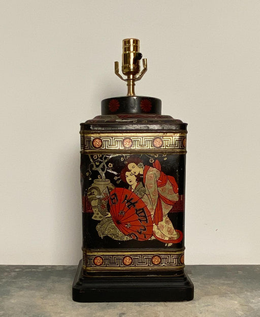 A mid Century tole tea canister lamp, circa 1950 American.