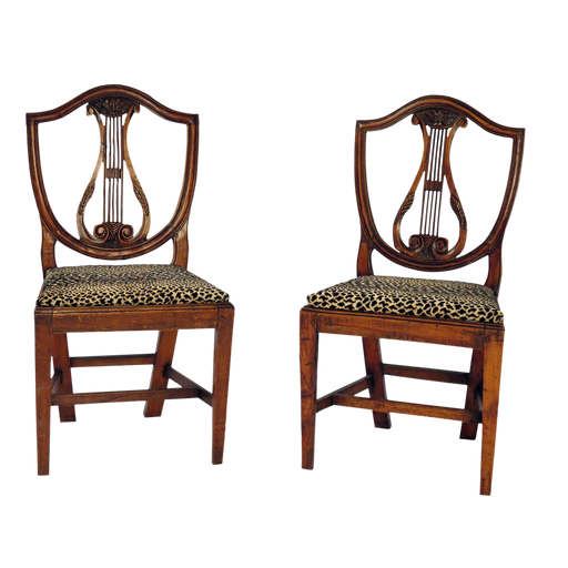 A pair of Italian Neoclassical walnut chairs, early 19th Century, about 1800. Similar to English designs, these chairs feature a wonderful styliz...
