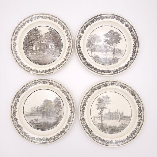 A set of three French early 19th century white transferware dinner plates (Creil type), circa 1800. Each plated depicts a country home of English C...