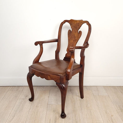 Burled and English Walnut armchair made in England circa 1880 after designs first done about 1720. Seat height 18".