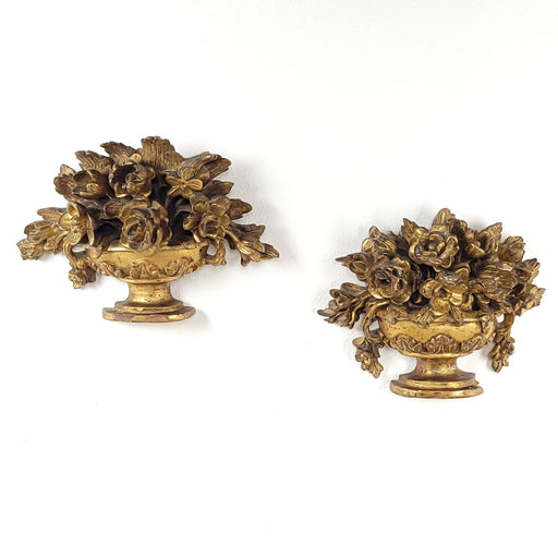 A good pair of giltwood plaques in the shape of floral urns, France, 19th century. One measures 8" h x 11.5" w x 2" d, and the other measures 8" h ...