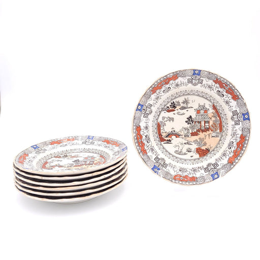 View full detailsA set of seven English Ironstone plates, circa 1860. The plates are decorated in the Chinese Taste, depicting a pagoda, lake and a fisherman done i...
