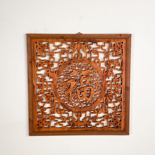 A Chinese carved wood panel, circa 1900. The panel has Chinese characters in the center and carved bats on in the corners.