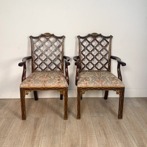 A pair of matching Chinese Chippendale armchairs with blind fretwork and gilt highlights. Seat height 19.75".