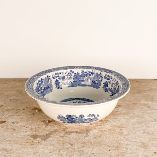 A blue willow wash basin, England circa 1880. The blue and white design is in the Chinese taste.