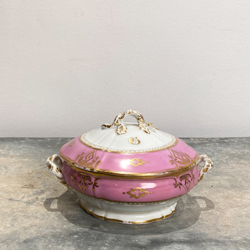 Antique & Art ExchangeOriginal price $395.00 - Original price $395.00Original price$395.00$395.00 - $395.00Current price $395.00| /A 19th Century French Paris Porcelain covered bowl, in pink and white with gilt highlights. The is a gilt Gothic "G" monogram on the cover.