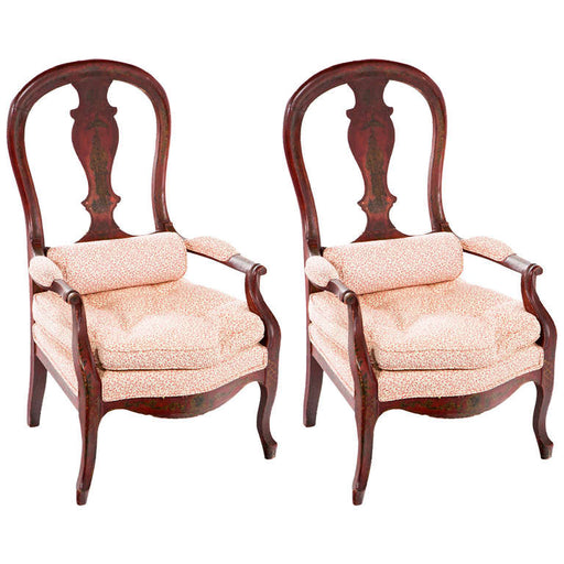 Circa 1860 Red Lacquered French Arm Chairs, A Pair