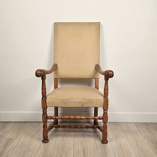 A French Baroque walnut armchair, large and comfortable with later springs. Seat height 19".