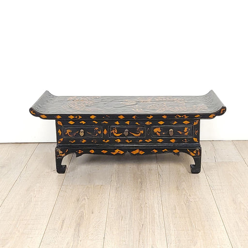 A Korean scholars low table with three drawers and hoof feet, inlaid with a dragon, circa 1900. This piece has small drawers for storage. The drago...