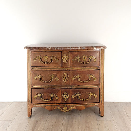 A Régence–Louis XV rosewood commode with gilt bronze mounts, inlaid with brass, and with a marble top. France circa 1740.