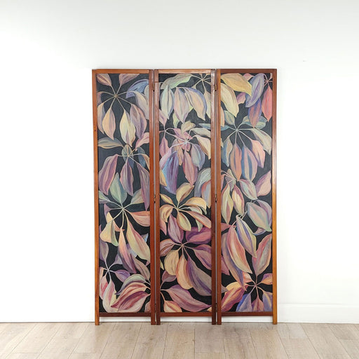 A three-panel screen by a local CCAC artist, done in the 1980s. The panels depict leaves in a multi of colors.