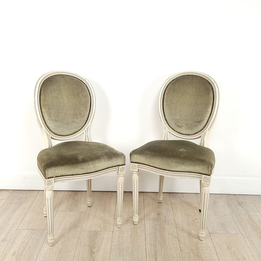 A pair of French Louis XVI style white painted oval chairs with green velvet upholstery. Seat height 19.75". Two pairs available.