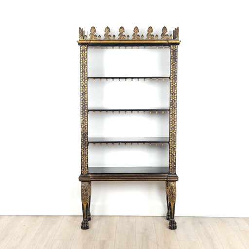 A 19th-century Anglo-Indian black painted and gilt set of shelves on lion's paw feet with elaborate palmette crown.