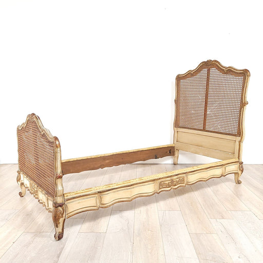 A Belle Époque painted and gilt French Louis XV–style bed, circa 1890. Inside measurements 35.75" w x 74" d.