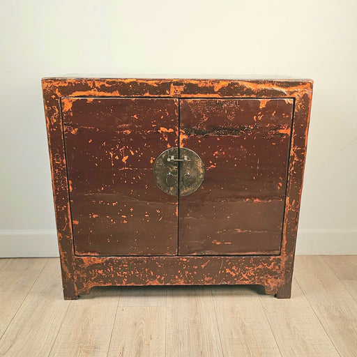 A cinnabar painted Chinese cabinet, late 19th century. Lacquer worn.