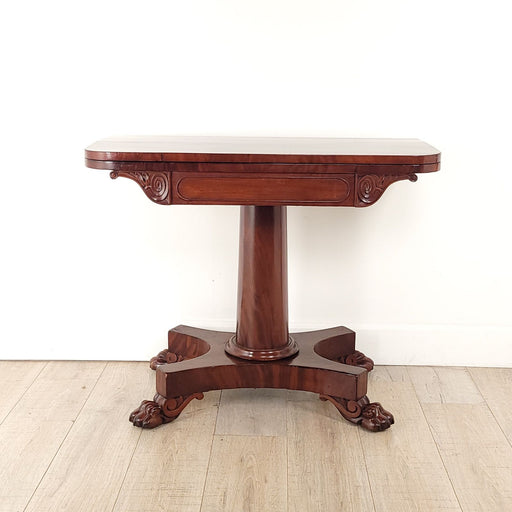 A very good William IV English mahogany pedestal table, circa 1830, with lion's paw feet and anthemion scrolls supporting the top, which twists to ...