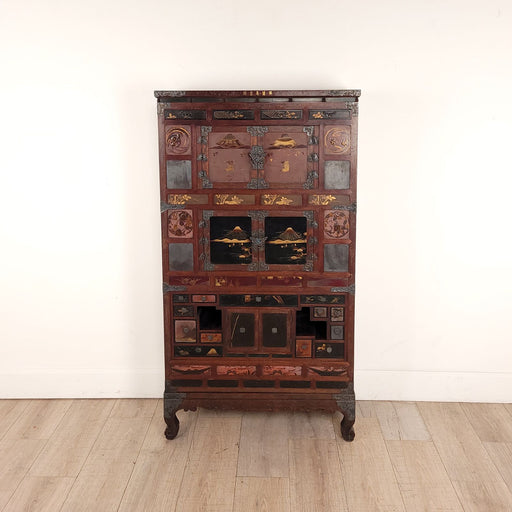 A fine brass inlaid and lacquered Korean tansu with white brass fittings, 19th century.