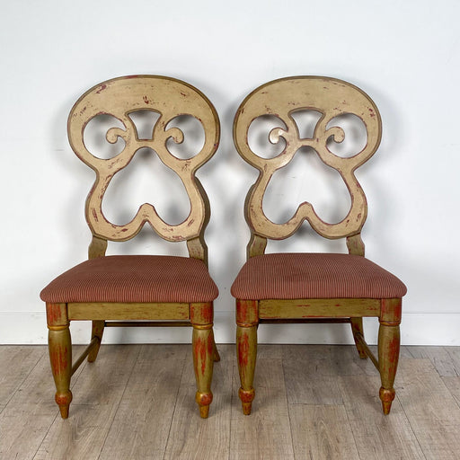 A pair of vintage Austrian style large side chairs in paint and wood. Seat height 18.5". Another pair available.