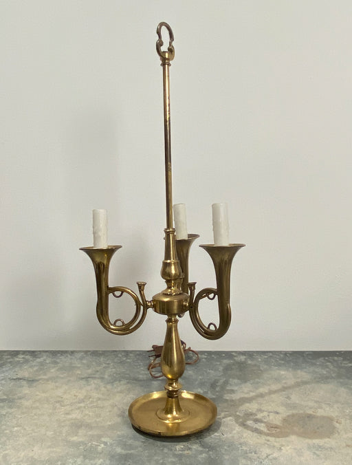 A vintage brass bouillotte lamp with French horns.