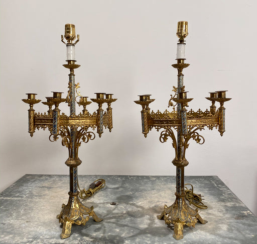 A pair of gilt and enameled candelabras later mounted as lamps, circa 1900 France.