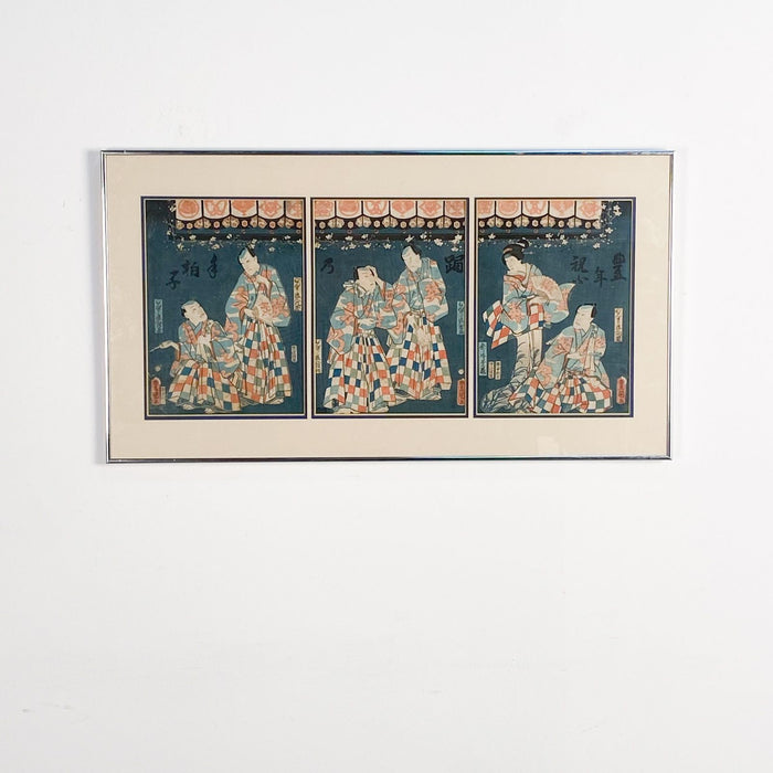 A Meiji triptych, circa 1870. Each woodblock depicts 2 figures dressed in traditional Japanese attire. The piece is framed as a triptych, with each woodblock signed by the artist.