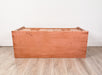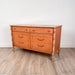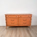A vintage six-drawer dresser, painted orange with faux bamboo trim on legs, U.S.A. circa 1950.