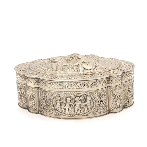 A silver plate on copper tea caddy with embossed Oriental scenes, Dutch, circa 1830.