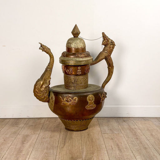 An enormous Mongolian tea pot, a gift to a diplomat, circa 1970. The tea pot is copper with brass decorations of Buddha and dragons.