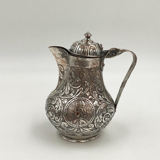 A 19th Century Turkish Style silver on copper water jar with a face of a man on one side and a geometric design on the other side, ware to silver.