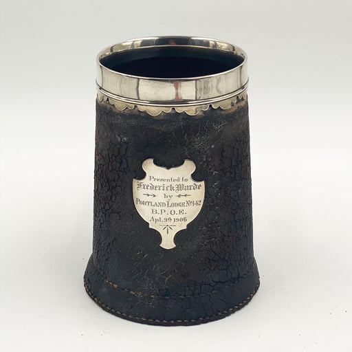 An early 20th Century leather tankard with a sterling silver rim and presentation plaque on the front. The plaque reads to Fredrick Maudes, Portlan...