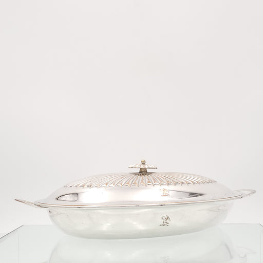 A silver plate serving dish, England circa 1930. Two available. The top and side are engraved with an eagle.