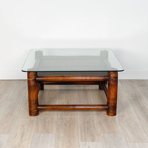 A Vintage McGuire Style coffee table with a glass top and a shelf covered in leather.
