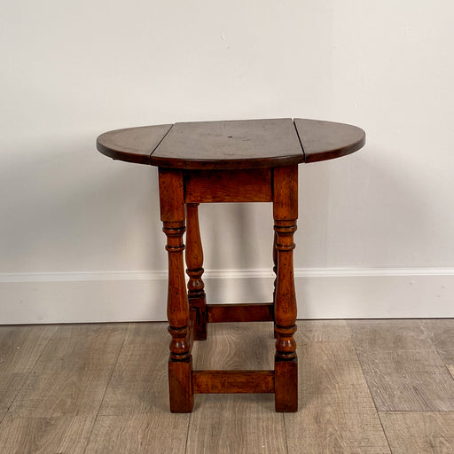 A nice small drop-leaf table drilled to be made into a lamp, England, 1920s. Measures 22" w when open.