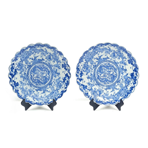 A pair of Chinese scalloped blue and white large plates or chargers, decorated with two dragons surrounded by playing children, circa 1900.