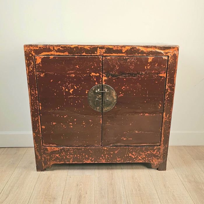 A cinnabar painted Chinese cabinet, late 19th century. Lacquer worn.