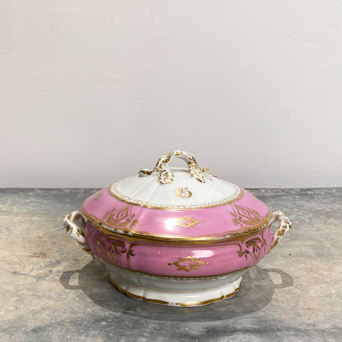 A 19th Century French Paris Porcelain covered bowl, in pink and white with gilt highlights. The is a gilt Gothic "G" monogram on the cover.