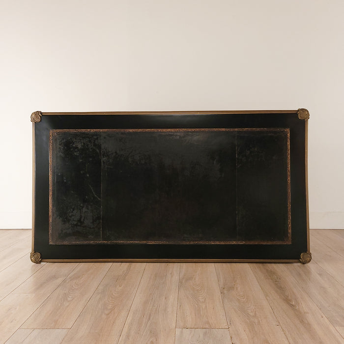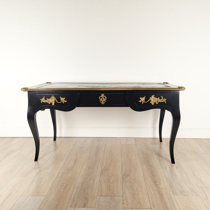 A Louis XV style 19th-century French bureau plat with a black leather inset top.