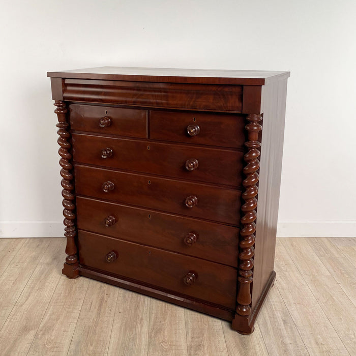 A Scottish 19th-century mahogany chest with frieze drawers and turned columns.
