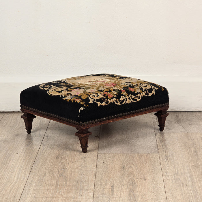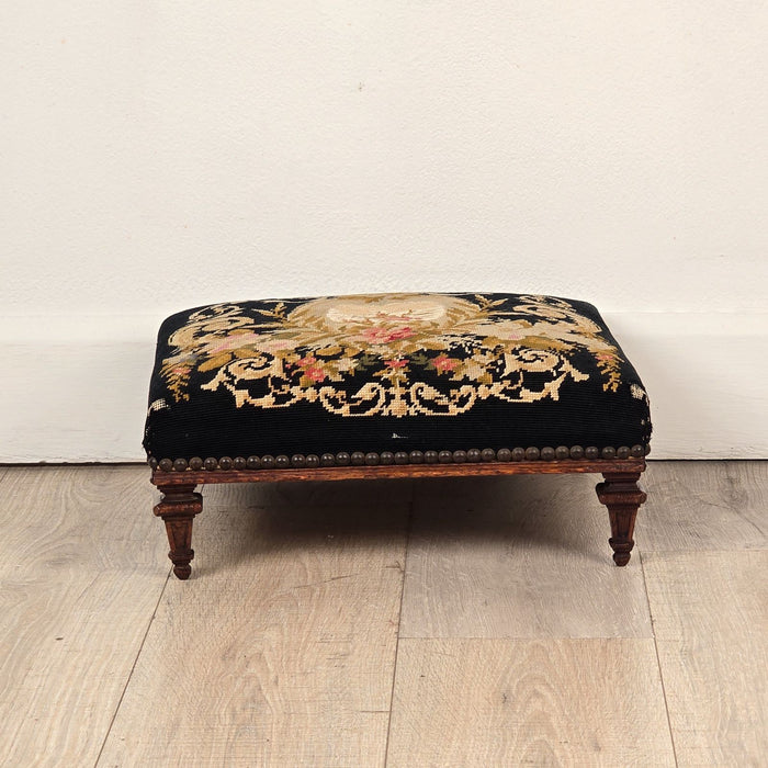 A well-carved French Louis XVI–style footstool with old needlepoint, circa 1850.